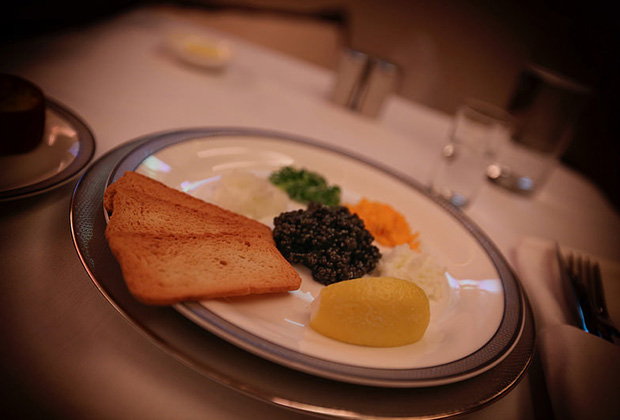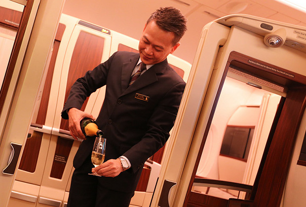 Из Японии в столицу Сингапура путешественники отправились рейсом "Singapore Airlines", но уже первым классом. За билеты, которые обошлись бы им в 12,5 тысяч долларов, они отдали всего 106 долларов и 103 тысячи "миль". Гиллеспи отмечает, что на борту самолета ему понравились сьюты, напоминающие просторные купе в поездах, а также ужин с осетровой икрой.